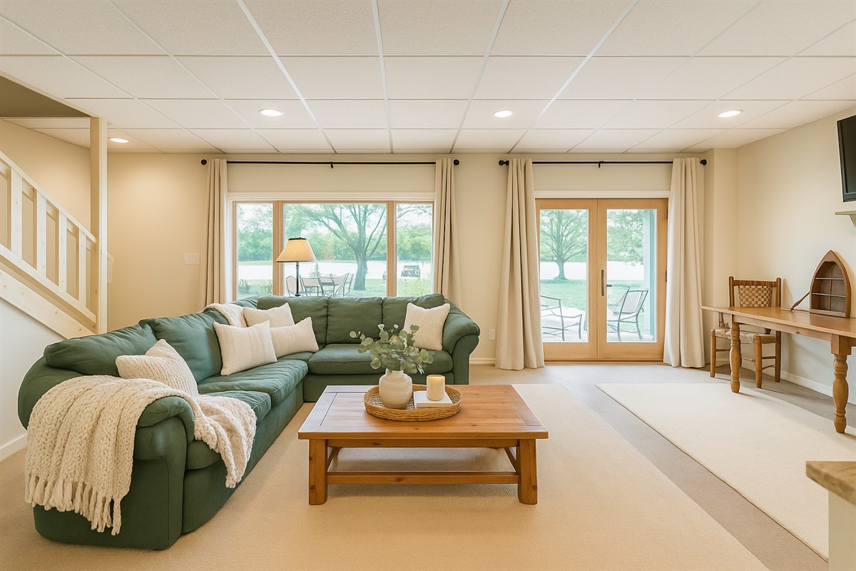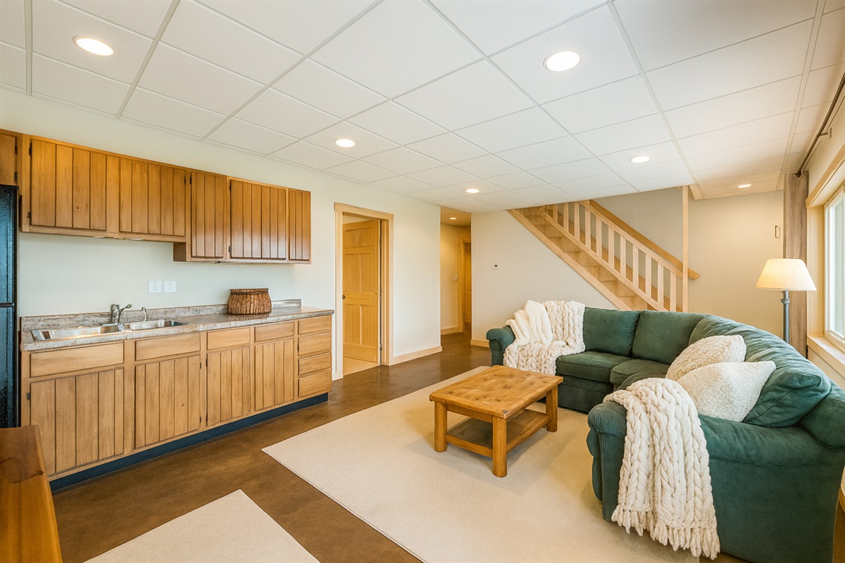 Family room: Oversized Family Room includes a sectional couch, large Roku TV with smart Bluray/DVD player, extra kitchen table for playing games or extra dining space, and an almost full 2nd kitchen. The large windows in this space provide an amazing view of the lake and full walk-out basement to the shore!