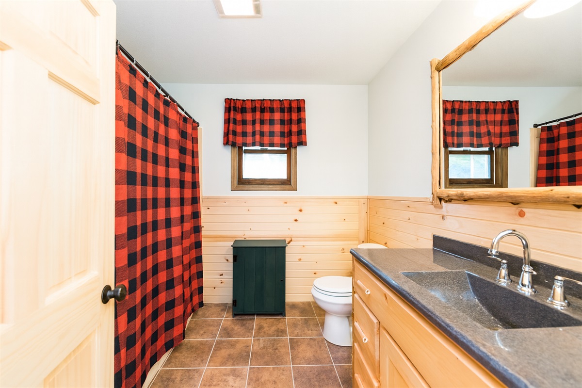 Main Floor Bathroom: The main floor bathroom is custom finished with knotty pine wainscoting, a full bathroom with a shower and bath.