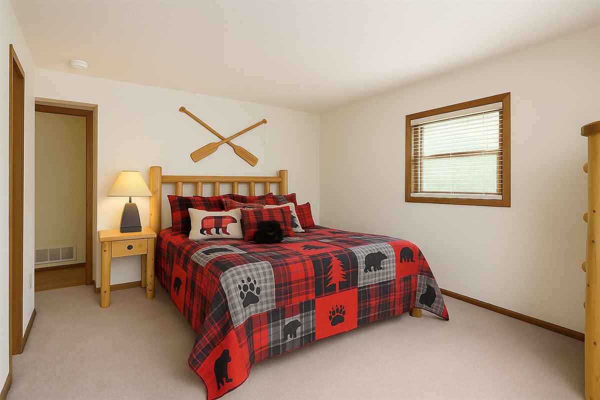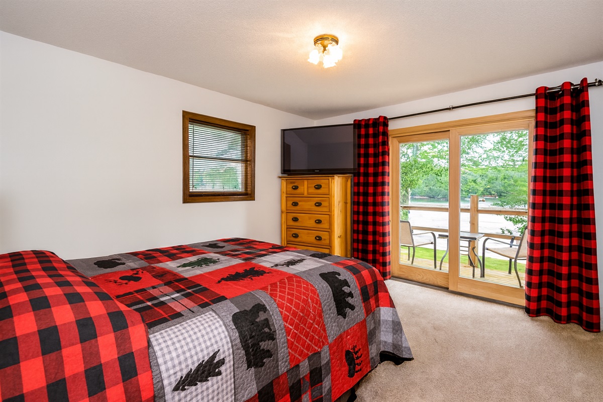 Master Bedroom: The crown jewel of the bedrooms! This bedroom features a King bed, a Roku TV, gorgeous custom log furniture, and a sliding glass door which allows you the ultimate views from bed! Drink a cup of morning coffee right from bed and enter onto your private section of the enormous deck with views of the quiet serene lake.