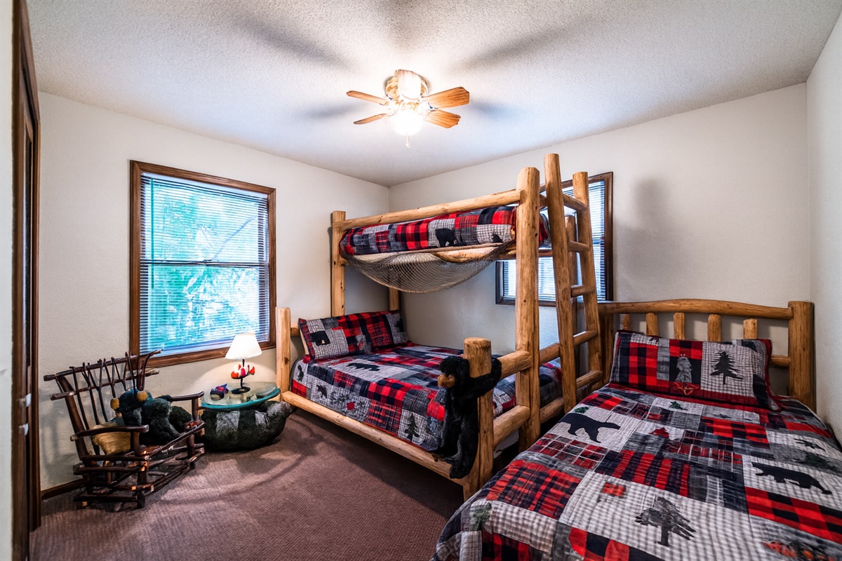Bedroom #2: The second bedroom also features custom log furniture, a full bed, and 2 additional twin beds.