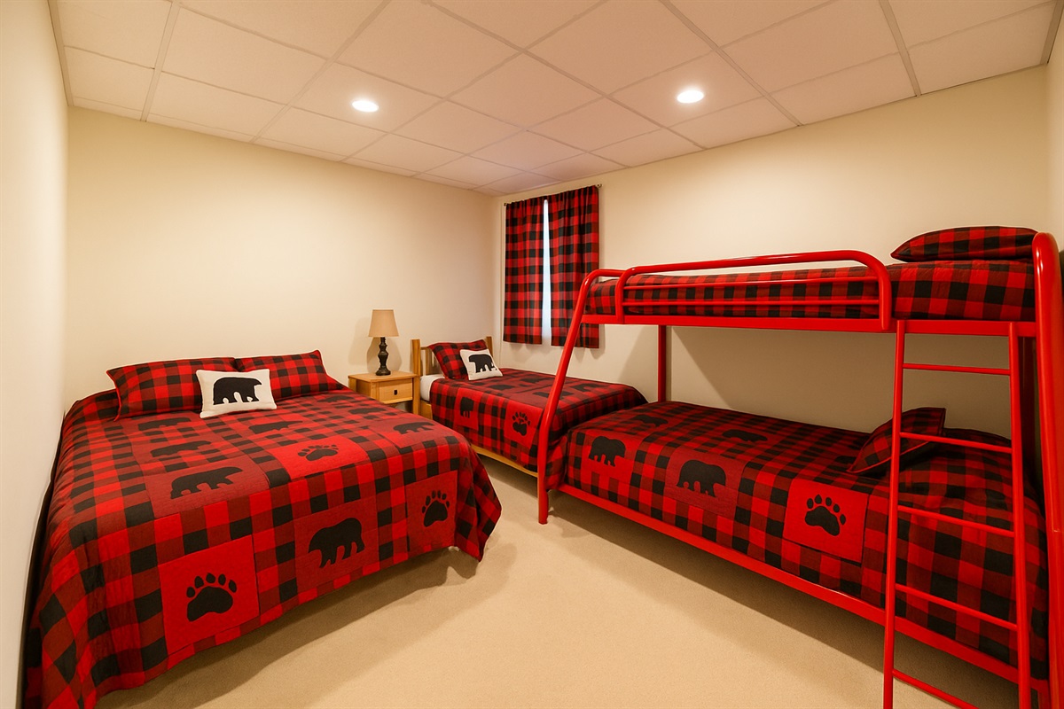 3rd Bedroom: Huge lower level bedroom features the following beds -1 queen, 1 full, and 2 twin beds. We also have a twin trundle bed if requested.